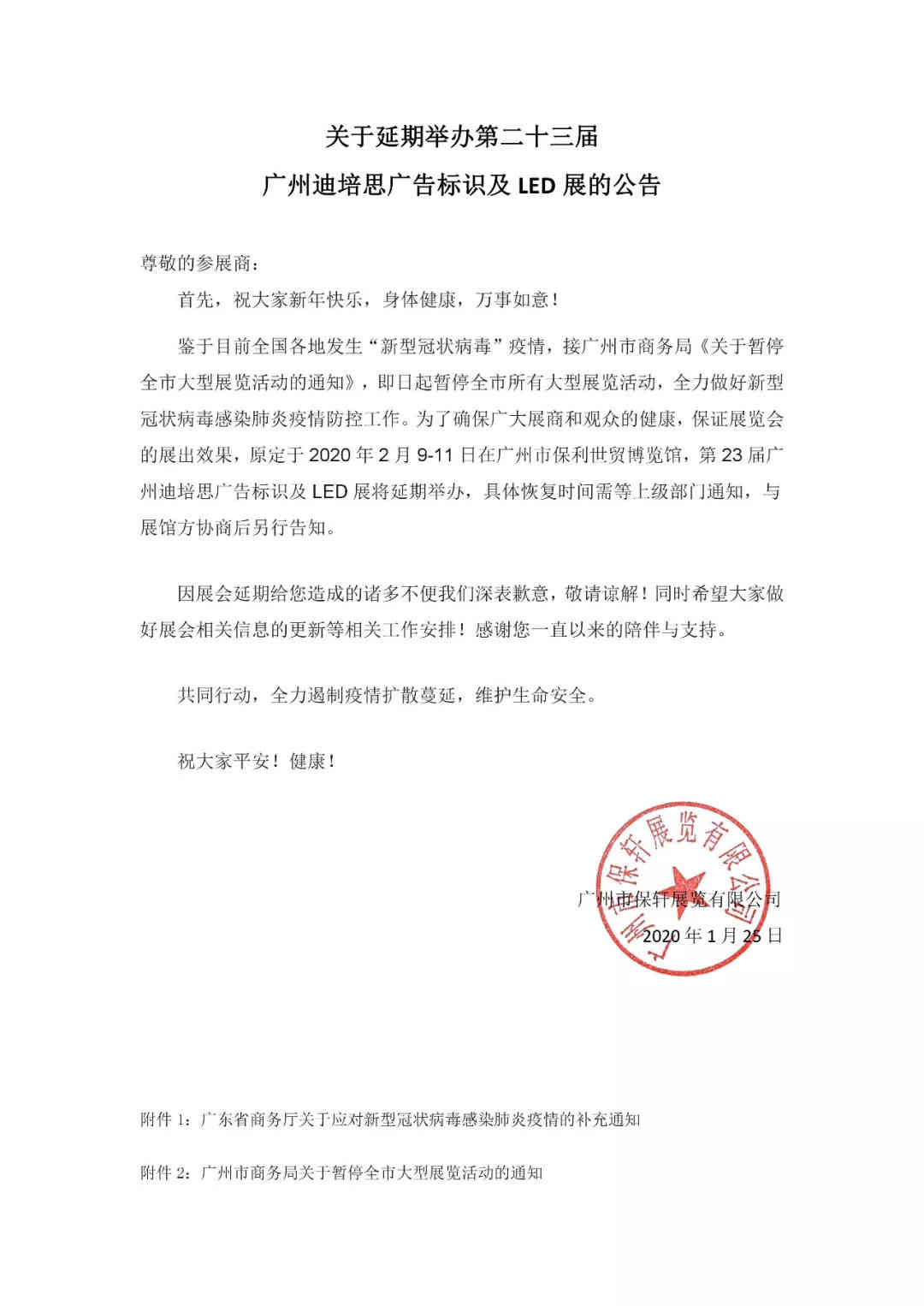 針對目前“新型冠狀病毒”的疫情防控要求,接廣州市商務(wù)局《關(guān)于暫停全市大型展覽活動的通知》,即日起暫停全市所有大型展覽活動,全力做好新型冠狀病毒感染肺炎疫情防控工作。為保障廣大展商和觀眾的健康,保證展覽會的展出效果,原定于2020年2月9-11日在廣州市保利世貿(mào)博覽館舉辦的“第23屆迪培思廣州國際廣告標識及LED展”將延期舉辦,具體恢復(fù)時間將根據(jù)形勢發(fā)展第一時間另行通知。